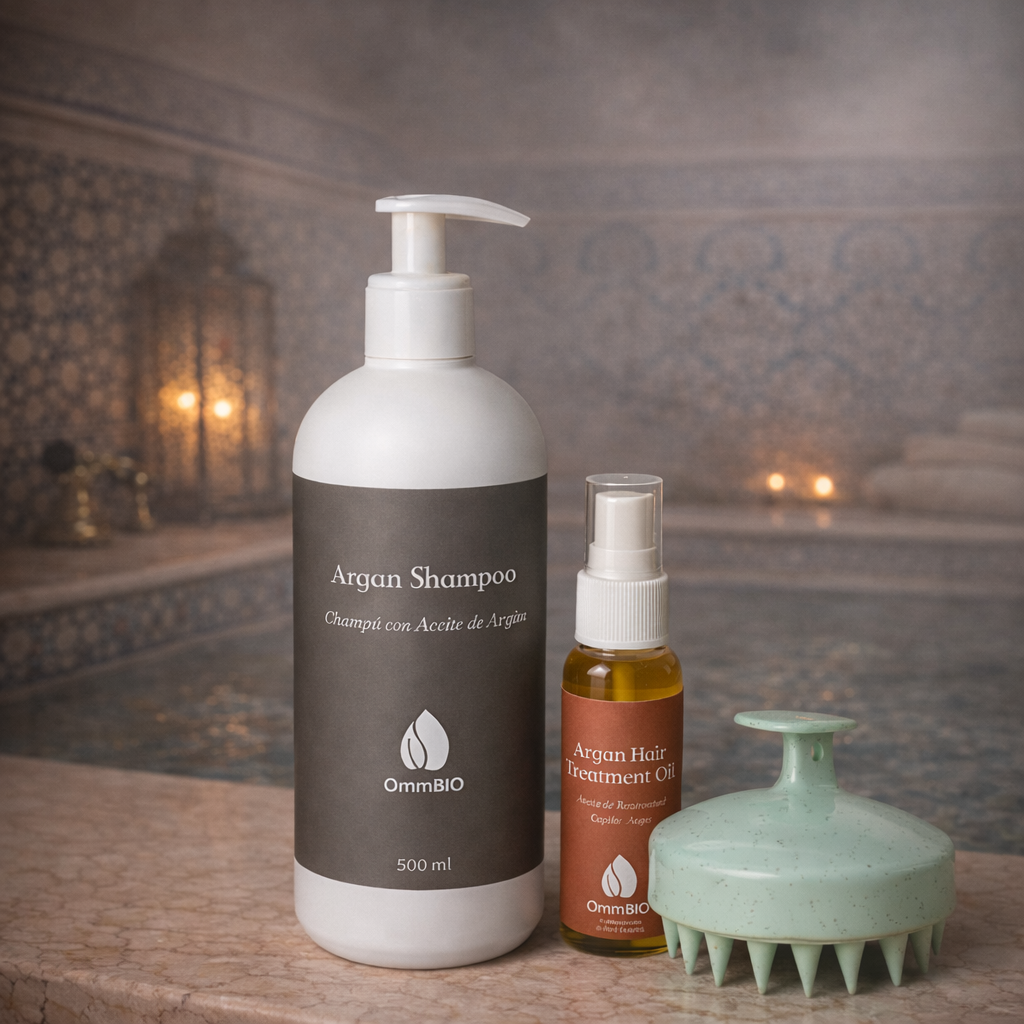 Le Coffret de Soin Capillaire Ommbio associe la nutrition intense de l'Huile d'Argan, la douceur du Shampoing Naturel à l'Argan et la stimulation de la Brosse de Massage du Cuir Chevelu pour revitaliser les cheveux de la racine aux pointes.
